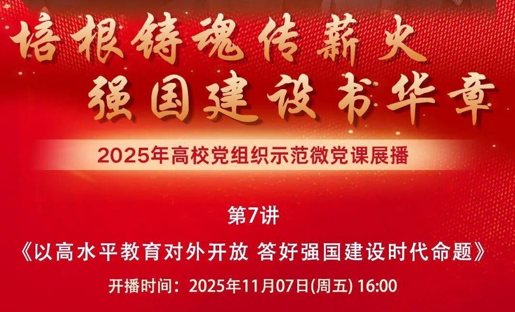 培根铸魂传薪火,强国建设书华章。11月7日(周五)16:00,跟随复旦大学、厦门大学、西北农林科技大学、华南理工大学,走进2025年高校党组织示范微党课第7讲《以高水平教育对外开放 答好强国建设时代命题》。关注微言教育微信,通过微言教育视频号、微博等平台收看直播——
